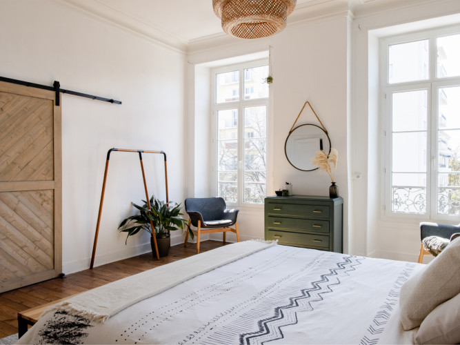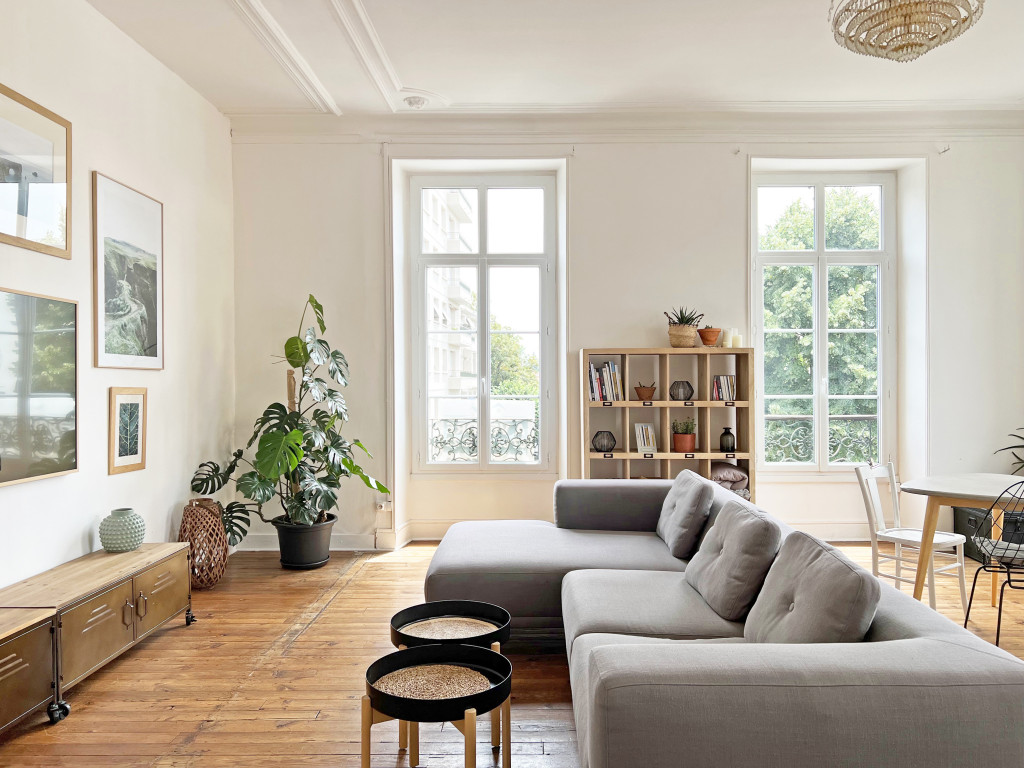 Au deuxième étage d'un immeuble datant de 1900 se niche un appartement lumineux aux accents vintage, véritable havre de tranquillité en centre ville. Totalement rénové en 2017, il se compose d'un vaste séjour avec vue sur les Pyrénées, d'une cuisine équipée séparée avec salle à manger, de deux chambres dont une suite parentale, d'un espace bureau aménagé et d'une salle d'eau. La double exposition Sud-Ouest permet à l'appartement de bénéficier d'une belle luminosité tout au long de la journée.