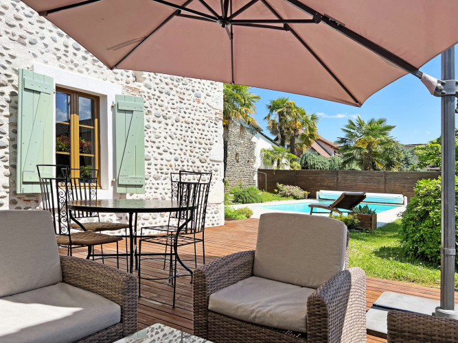 À moins de 20 minutes de Pau, cette ancienne ferme familiale réserve bien des surprises. Au sein de cette bâtisse datant du 18ème siècle, l'esprit contemporain se conjugue au charme de l'ancien pour un résultat chaleureux à souhait. D'une superficie habitable de 170m2, elle a été bâtie sur deux niveaux. La lumière naturelle, les couleurs douces et les murs en galets donnent à ces lieux un cachet authentique ! Au rez-de-chaussée, le séjour et la salle à manger s'étendent sur près de 50 m2. Grâce à son poêle à bois et son accès sur l'extérieur, cette pièce de vie arbore une ambiance conviviale. Dans la continuité du salon vous bénéficierez d'une cuisine en bois ; rappel au style traditionnel. Entièrement équipée et fonctionnelle, celle-ci profite d'une pièce annexe actuellement aménagée en salle d'eau et buanderie. L'escalier vous conduira à l'étage se composant de 2 chambres spacieuses ainsi que d'une grande salle de bains. À l'extérieur, la terrasse et sa piscine profitent d'une agréable exposition Sud-Est. Amoureux de la pierre et du style champêtre, vous risquez d'être subjugués !